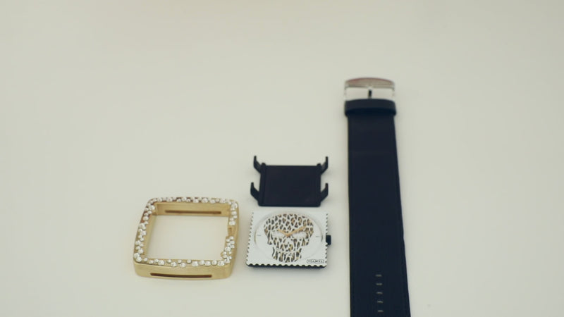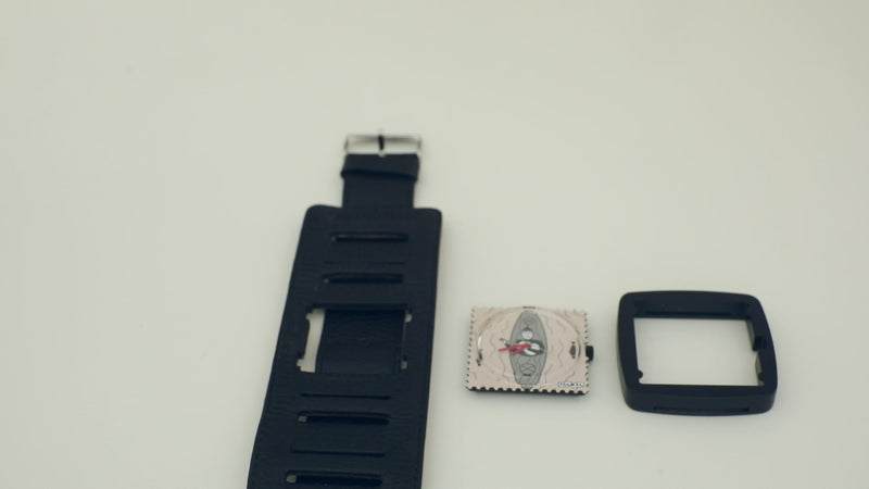 So kombiniert ihr eure STAMPS Uhr mit einem Jack-Rahmen und einem klassischen Armband – einfach die Uhr von hinten einsetzen und das Armband durch die Schlitze fädeln. Hierbei wird kein Snapper benötigt.