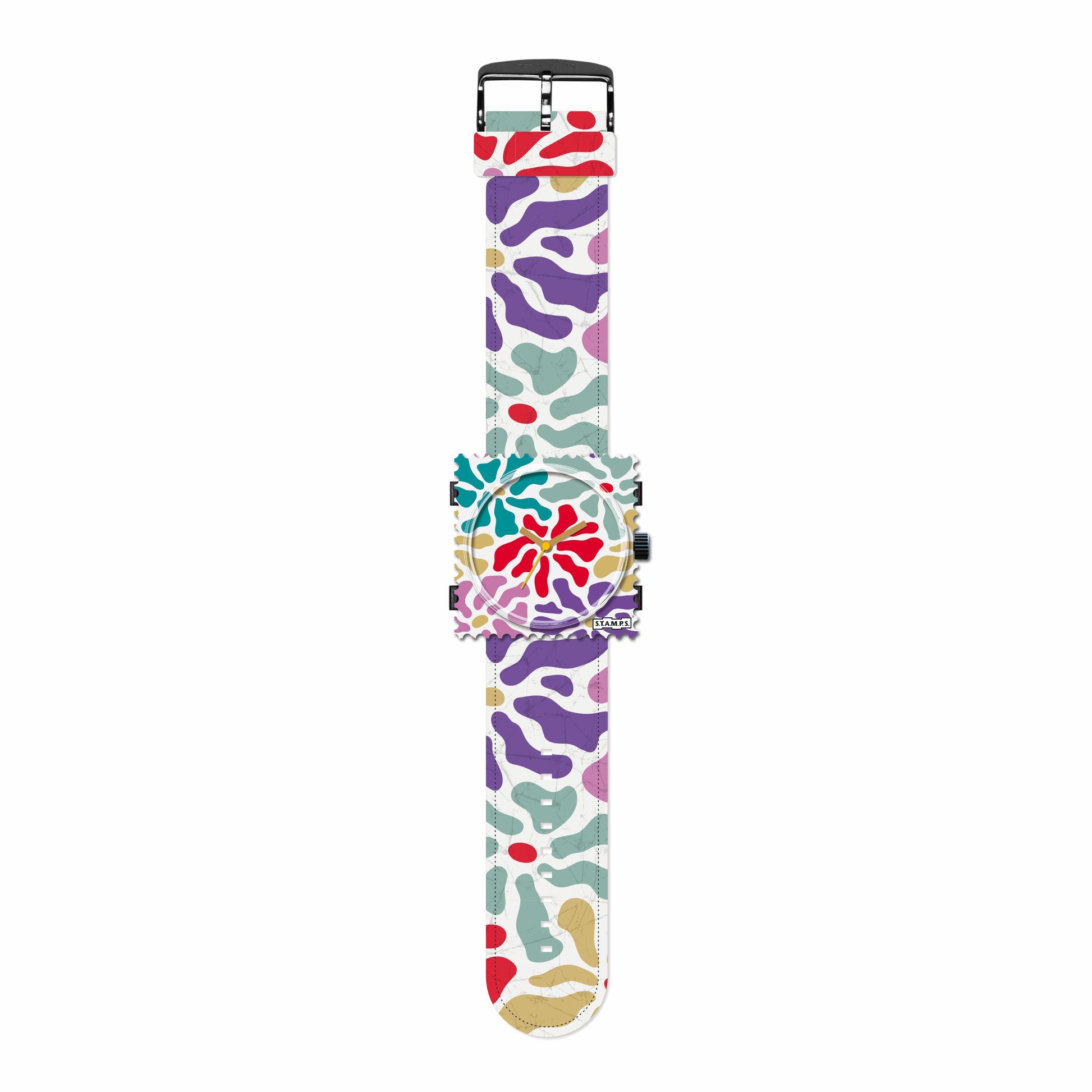 The watch in the classic STAMPS format (42 x 42 mm) is made of robust plastic and is equipped with a precise Seiko quality movement. Thanks to the clever snapper system, you can quickly and easily attach the watch to the strap or exchange it. This allows it to adapt flexibly to your style and can be combined with other motifs.