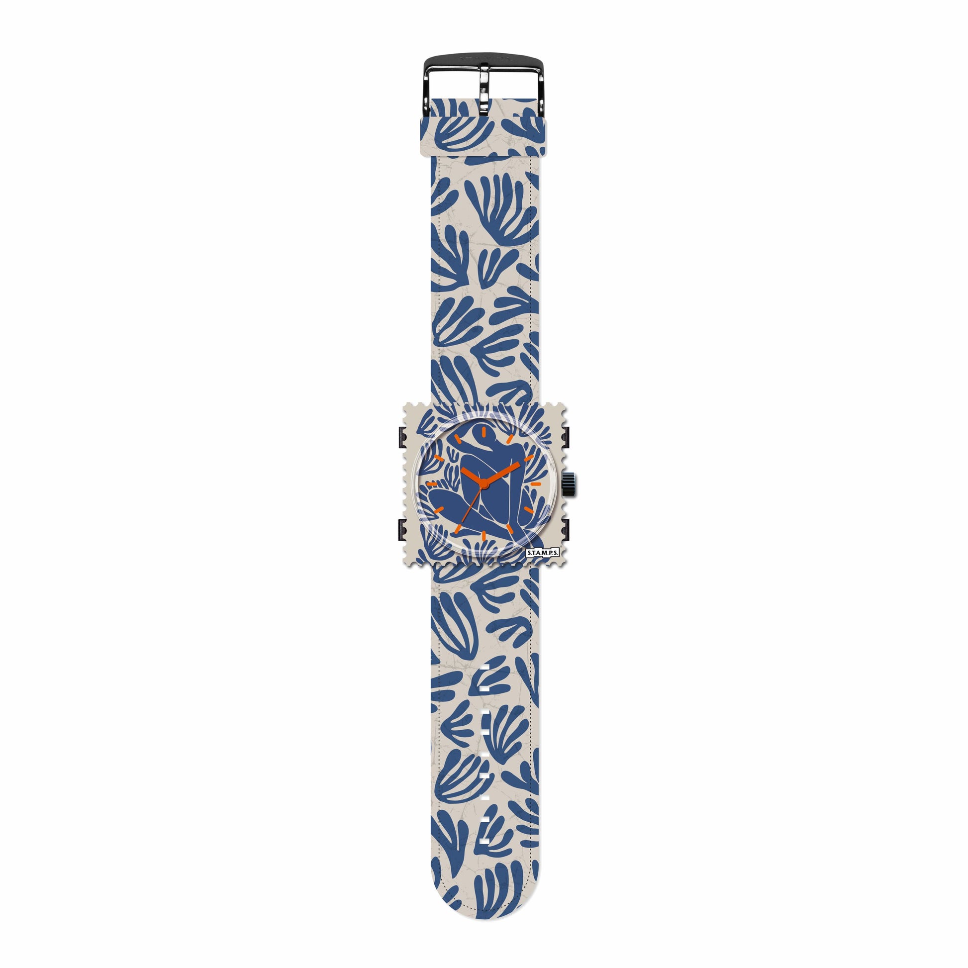 With the STAMPS ‘Matisse’ watch set, time becomes an expression of art and style. Inspired by the lightness of the sea and the shapes of Henri Matisse, this exclusive set features an artistic blue coral pattern on the strap and dial. An elegant silhouette of a woman adorns the dial as a central design element – timeless, modern and full of expression.